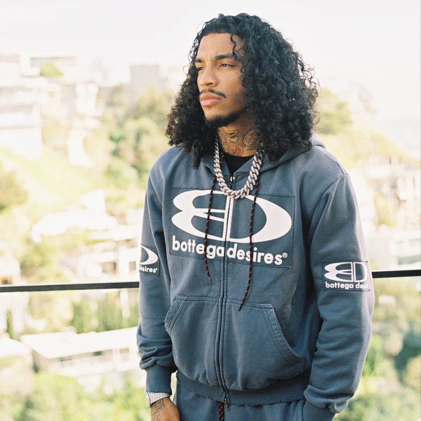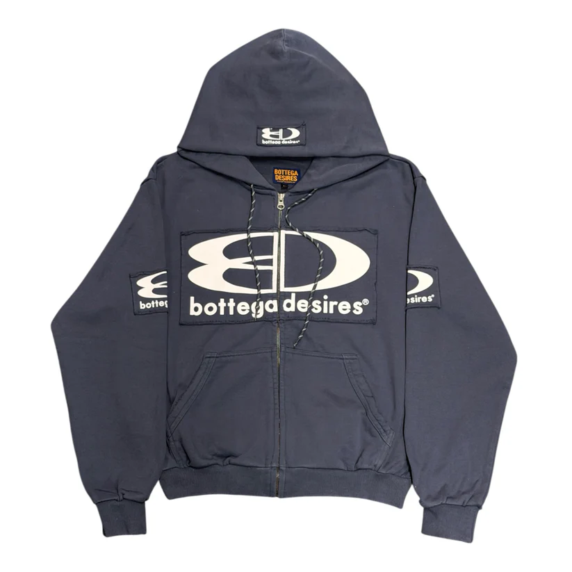 The Bottega Desires Tech Jacket – Blue blends modern streetwear style with everyday comfort. Made from premium French terry cotton, this zip-up tech jacket offers lightweight durability and breathable wear. The bold appliqué logos on the chest, sleeves, and hood create a standout designer streetwear look.